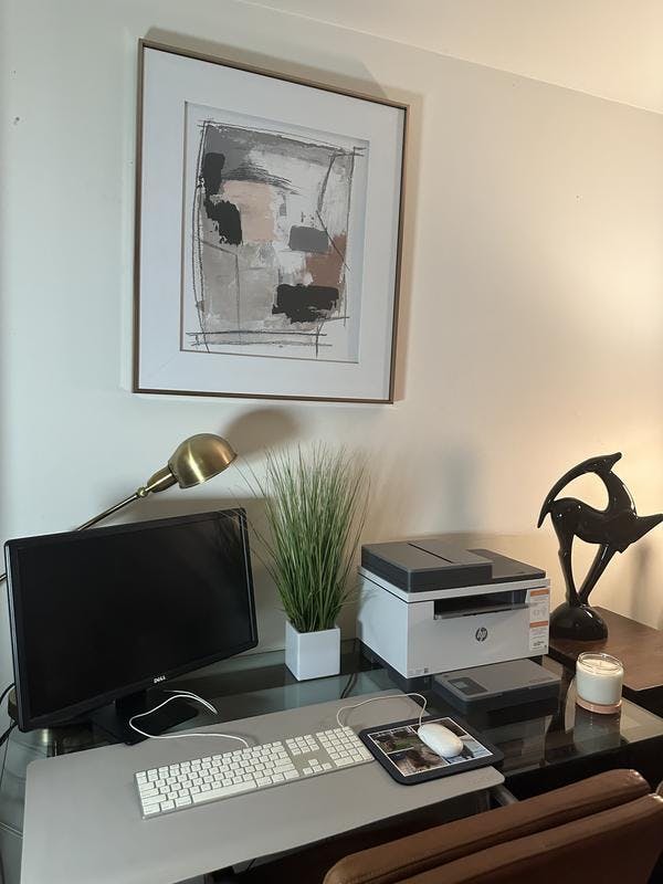 This is a beautiful painting and it works so well in my home office. I love the framing of the picture. It’s very professional with the white interior border, gold outer frame and glass covering. I’m also a big fan of the colors used as they compliment well with other items in the room. The art itself is striking and your eyes are immediately drawn to it upon entering the room. I’m very pleased with my selection.