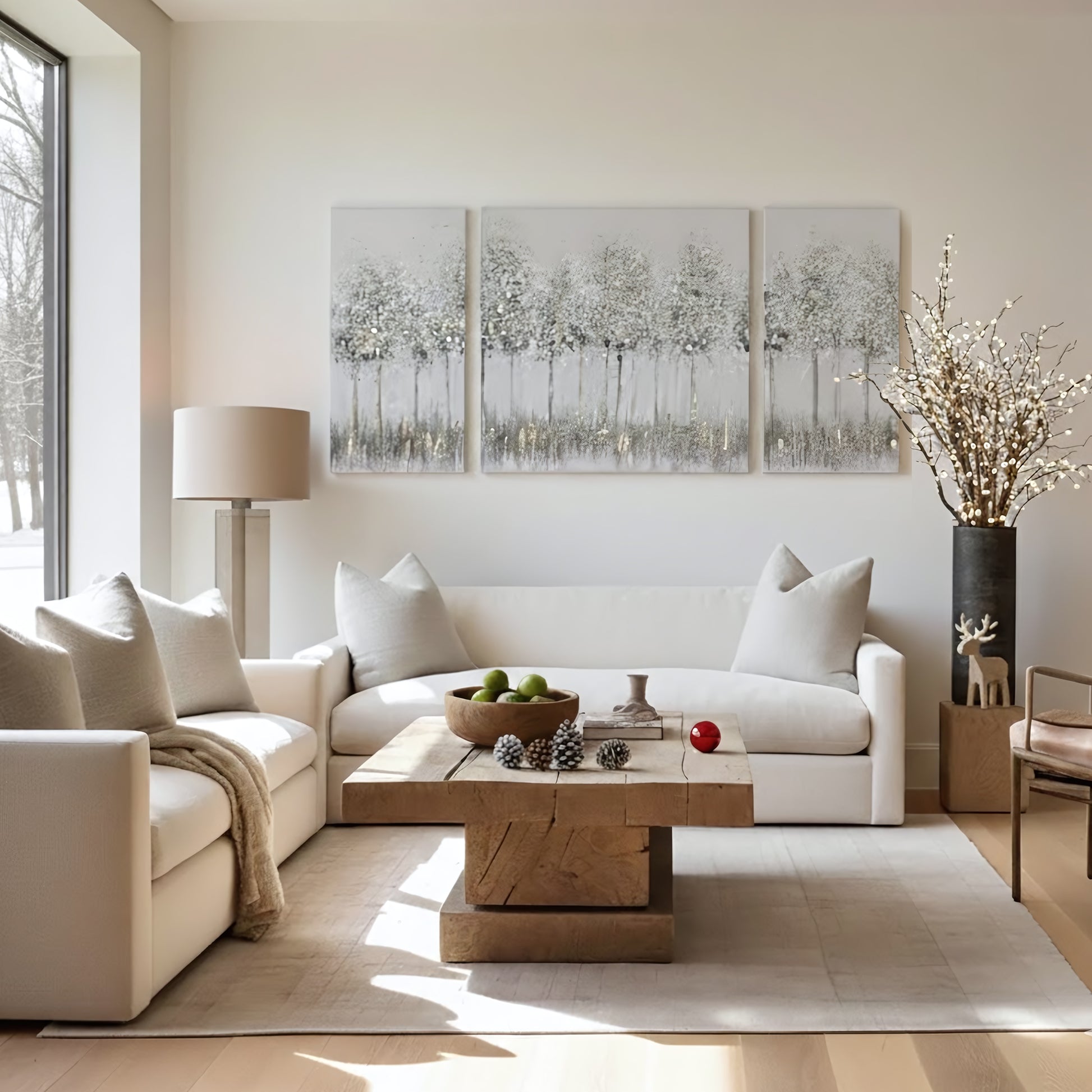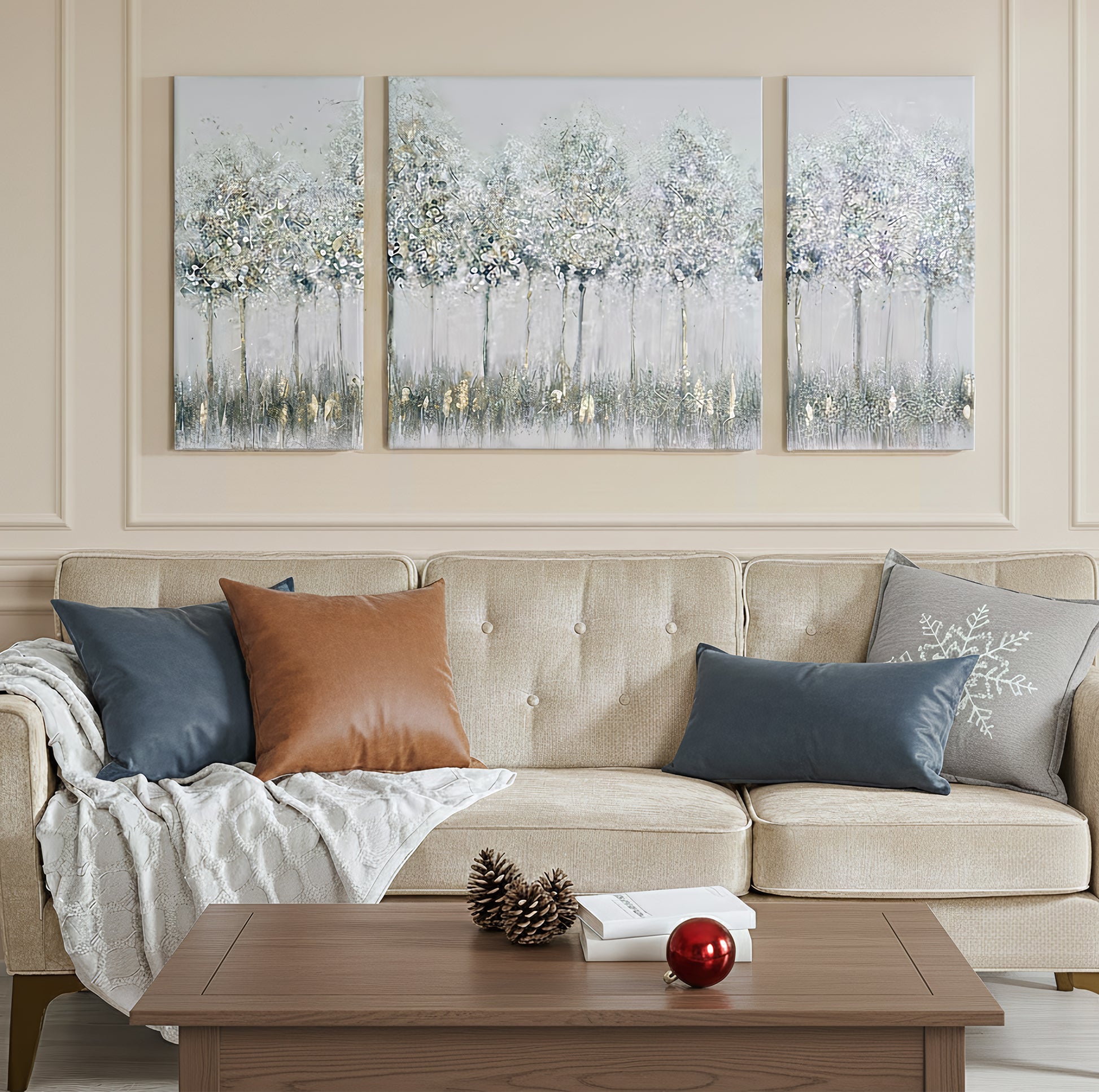 - Triptych canvas wall decor set with blue and grey abstract forest art