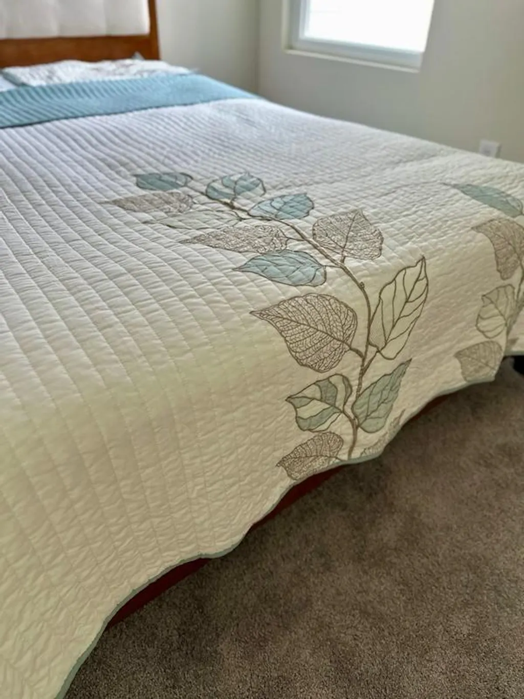 - Full/Queen fearures 2 columns of leaf embroidery, King/Cal King fearues 3 columns of leaf embroidery