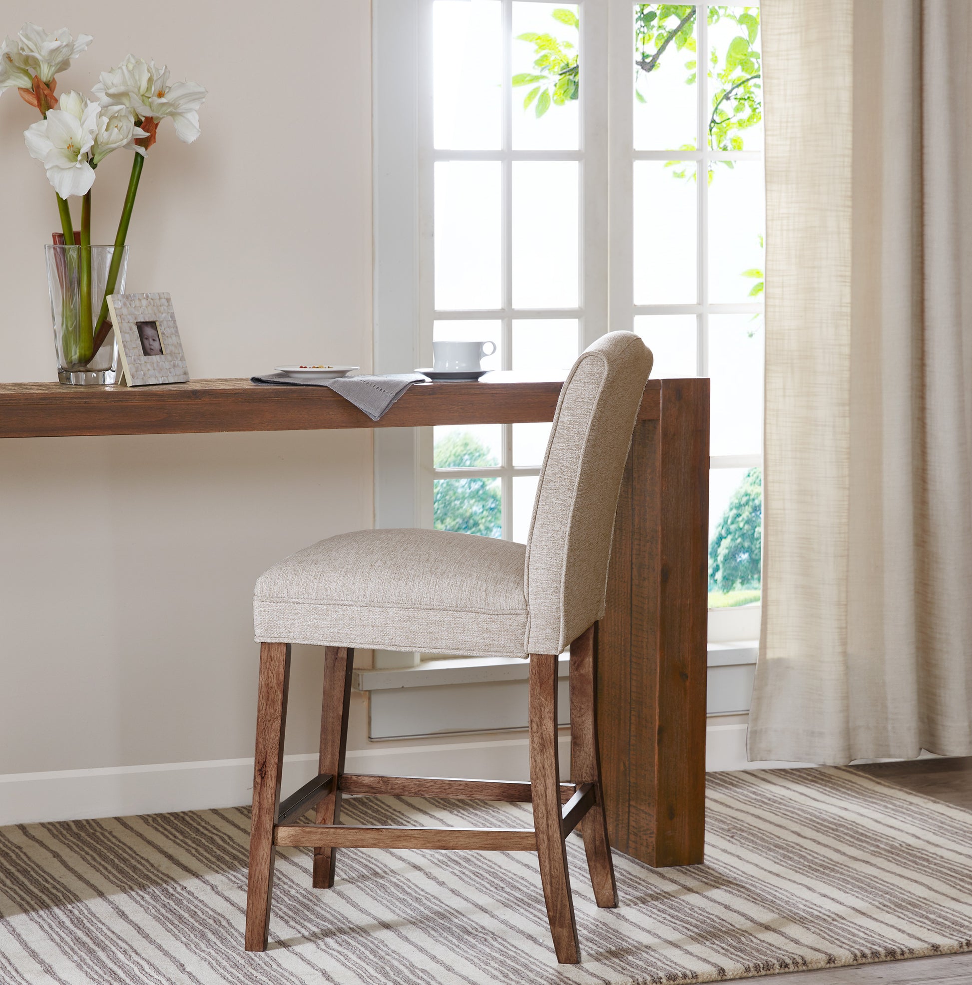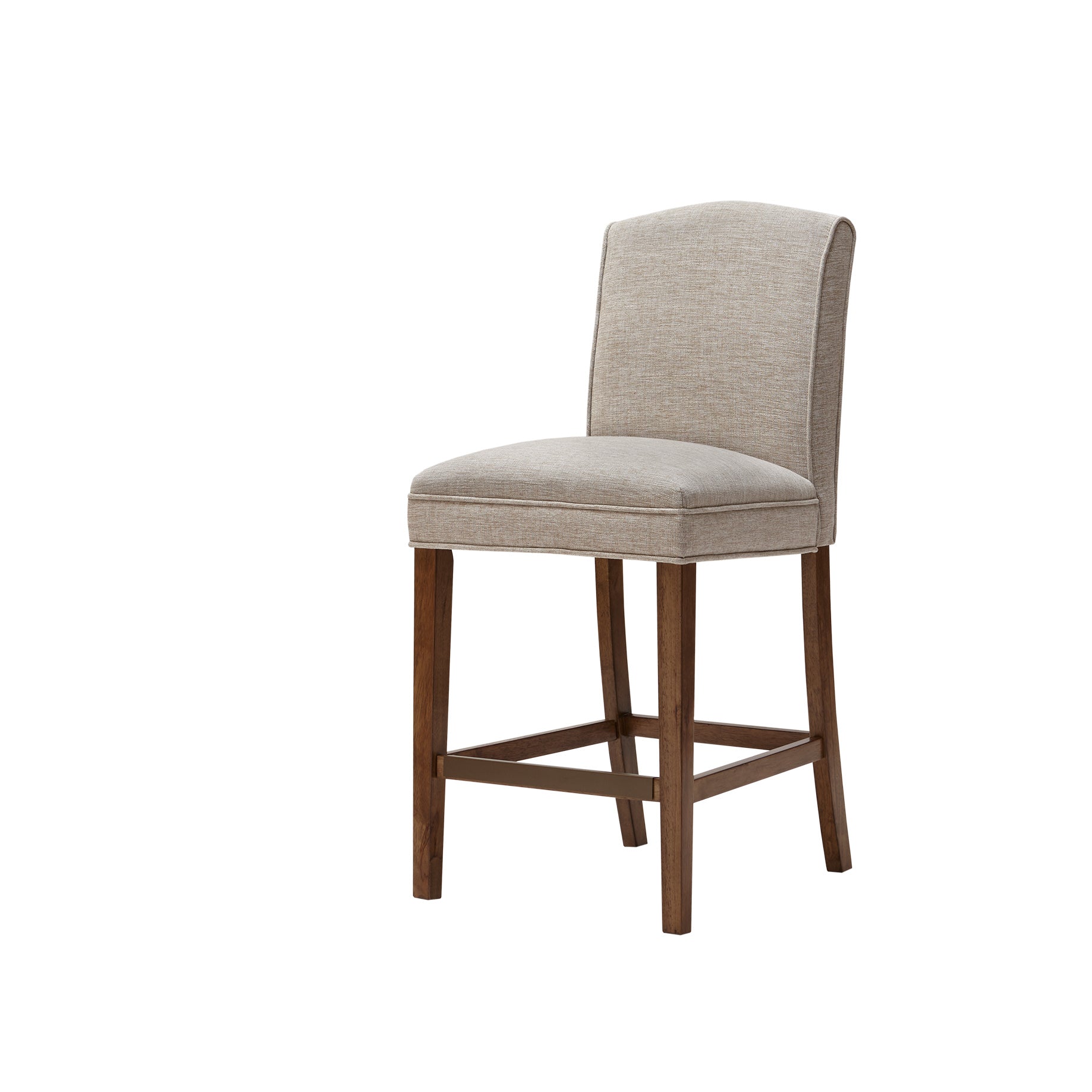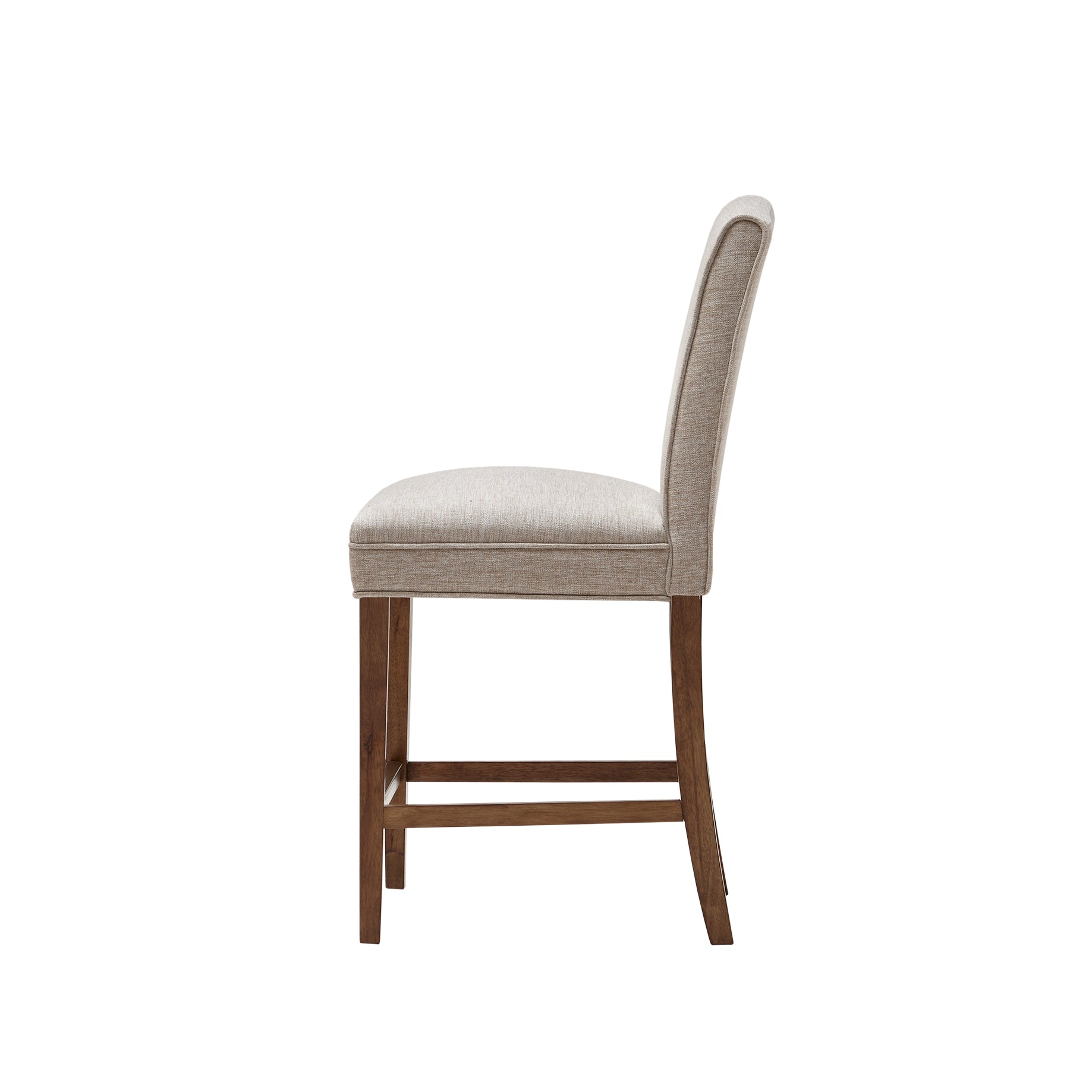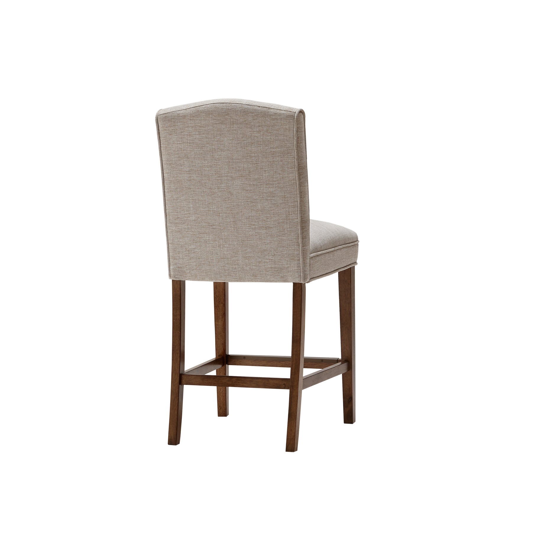 Complete your living space decor with the Camel Counter Stool. Simple a clean in design, this chair features a tall wing back support. It is upholstered in a sleek cream fabric filled with high density foam for maximum comfort. The stool stands on birch wooden legs in elm finish. Assembly required.
