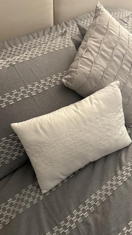 I was looking for a new comforter and was happy to find this one. The style is beautiful and the comforter is the perfect width (not too thin or thick). I also am a fan of the matching pillow cases and throw pillows as it adds to the overall look. My main issue is that the comforter smelled like chemicals out of the box and needed to wash/dry it a few times to get the initial smell out, though the smell eventually did go away, and fortunately did not affect the overall quality of tue product