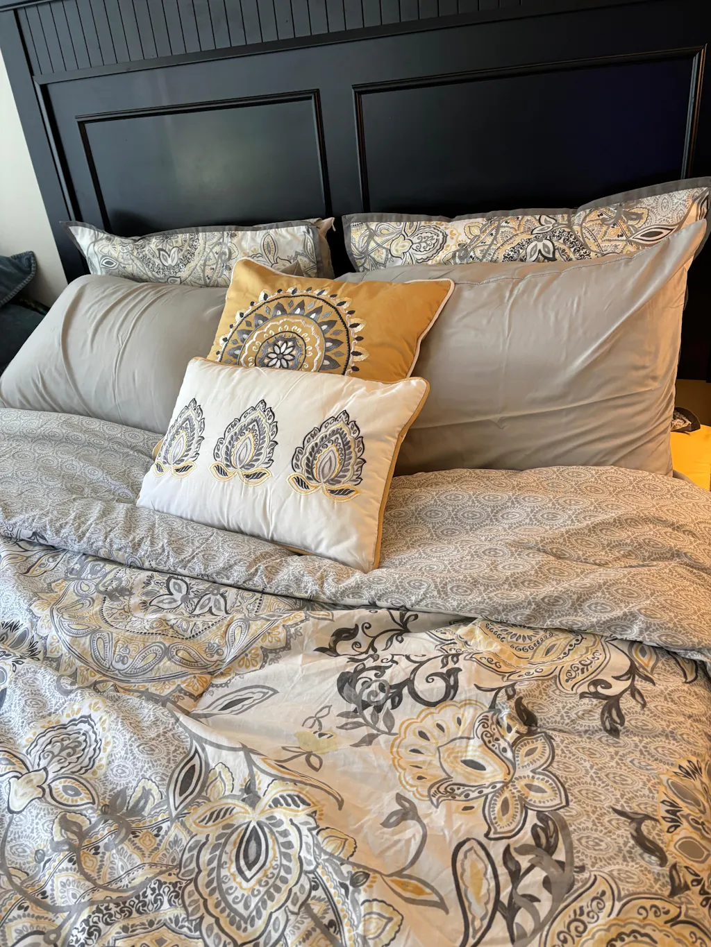 - Embroidery and piping details on the square and oblong pillows
