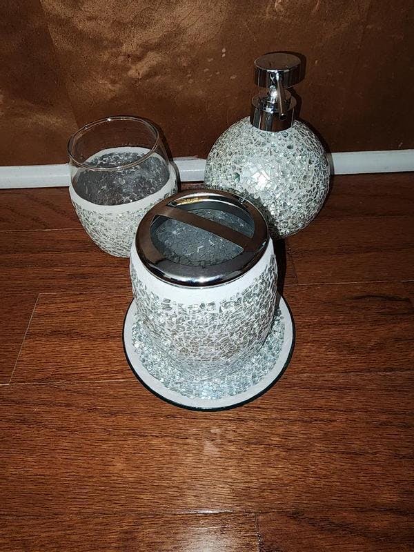 I really love this bathroom accessory set. It is so pretty and very unique. The mosaic design and the silver color make this set look expensive. The four pieces included are all accessories that I like to have. This set would look great in any bathroom. All of the pieces are easy to clean. This set is definitely well made and the quality is exceptional. I am very happy with this beautiful set.