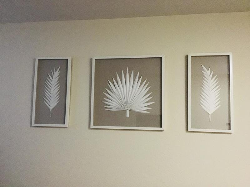 Bring a touch of nature indoors with this 3-piece wall art set featuring handmade rice paper palm leaves, soft linen backgrounds, and white shadowbox frames. Hang together or separately for a calm, textured look. Indoor use only. Spot clean.